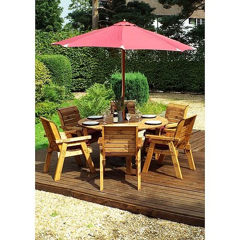 6 Seater Round Table Set: The 6 Seater Round Table Set is an ideal dining set for a family keen on dining alfresco. The 6 Seater Round Table Set is made of Scandinavian Redwood which is a beautiful and durable wood resistant to decay and disease. It is fully treated for your peace of mind. The generously sized and sturdy seats come with a set of cushions in any one of three attractive colours. The set also includes a parasol with its base and a storage bag for the cushions. Gather your loved ones and share a pitcher of margaritas, finger food, dinner, or Sunday roast amid your lovely garden. No matter the moment, the 6 Seater Round Table Set is sure to enhance your outdoor space with its traditional design and its rustic charm of natural wood.Please note that uses the White Glove bespoke delivery and assembly service.
