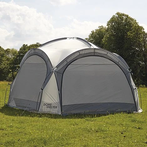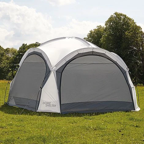 Measuring 13ft x 13ft this shelter offers approximately 15.7 square metres worth of sheltered living space. The dome shelter is showerproof, and offers UV30+ protection from the sun, meaning that you, your guests and any furniture will be kept safe and dry whilst the shelter is in use. The centre gives you a whole 2.6 metres of head room, ample space for adults to be able to stand upright.