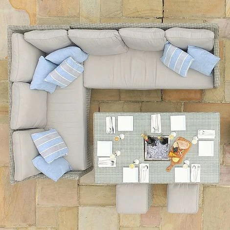 The Oxford Corner Dining Set is a beautiful garden furniture set which combines relaxation with comfortable dining. The Maze Rattan Dining Set is made with stylish grey rattan weave, handwoven onto a powder coated aluminium frame ensuring it is fully weather and rust resistant that can be left outside all year round. The Oxford Corner Set consists of a rectangular rising table topped with toughened safety glass, the adjustable table allowing you to go from lounging to dining in an easy transition. The Corner Set also includes a large modular corner sofa with seat and back cushions for added support and comfort, three footstools for additional seating and an integrated ice bucket perfect for the summer months. Whilst the cushions are showerproof we would always recommend taking them in doors when not in use, even if the furniture is covered.